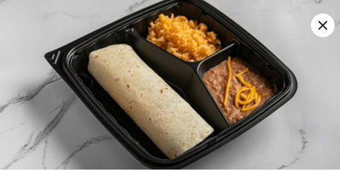 Bacon, chedar cheese, scrambled eggs, onions, tomatoes, refired beans, and rice